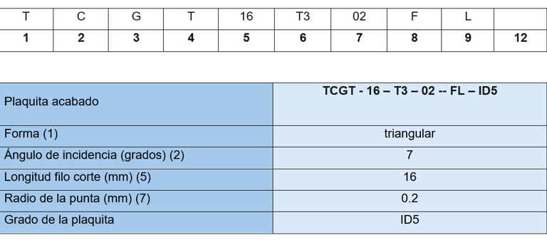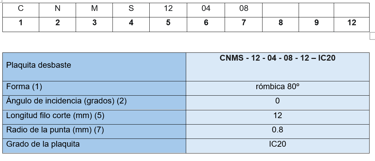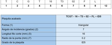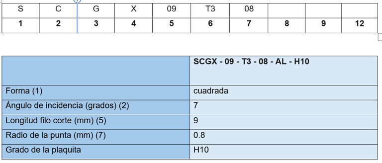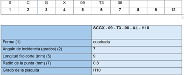 La plaquita que nos muestra la aplicación es SCGX09T308 - AL - H10. Denominación según ISO 1832 2017