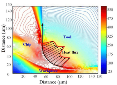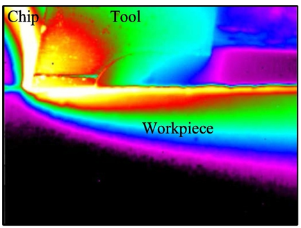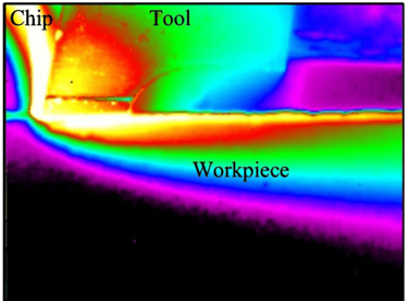 En estas imágenes se ve cómo se distribuye la temperatura entre la herramienta (tool), la pieza a mecanizar (workpiece) y la viruta (chip). Se puede observar cómo se expande el calor desde la punta de la plaquita hacia su interior.