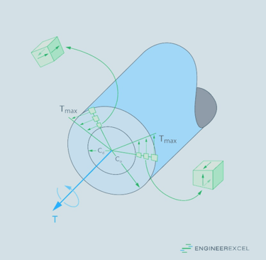 El esfuerzo cortante debido a la torsión es mayor en la periferia del eje y nula en la línea neutra.